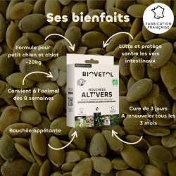 Roulement de tambour pour la révolution intestinale des chiots et petits chiens. Qui aurait cru que les pépins de courge, ces petits trésors que même votre petit compagnon ne penserait pas à déterrer du jardin, seraient les champions cachés de la lutte contre les vers plats ? C’est l’ingrédient qui permet à la magie d’opérer dans la poudre alt'vers BIOVETOL certifiée par Ecocert selon le référentiel agriculture biologique.