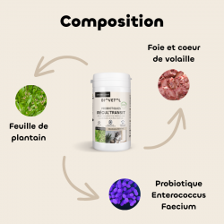 PLANTAIN* (Plantago lanceolata L., feuilles) 45%, RACINE DE RÉGLISSE* (Glycyrrhisa glabra L., racine) 17%, DÉRIVÉ DE LEVURE (obtenu à partir de Saccharomyces cerevisiae). Additifs : additif zootechnique (stabilisateur de la flore intestinale) : Bacillus Velezensis DSM 15544 (4b1820) 4x1011UFC/kg ; additifs technologiques (anti-agglomérants) : Kieselgur (Terre de diatomée, purifiée) (E 551c) 157,1 mg/g, Argiles Kaolinitiques (E 559) 114,6 mg/g.