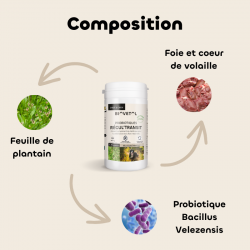 PLANTAIN* (Plantago lanceolata L., feuilles) 45%, RACINE DE RÉGLISSE* (Glycyrrhisa glabra L., racine) 17%, DÉRIVÉ DE LEVURE (obtenu à partir de Saccharomyces cerevisiae). Additifs : additif zootechnique (stabilisateur de la flore intestinale) : Bacillus Velezensis DSM 15544 (4b1820) 4x1011UFC/kg ; additifs technologiques (anti-agglomérants) : Kieselgur (Terre de diatomée, purifiée) (E 551c) 157,1 mg/g, Argiles Kaolinitiques (E 559) 114,6 mg/g.