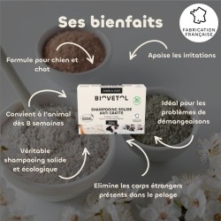 Votre animal se gratte tellement qu'on pourrait penser qu'il vise le record du monde de démangeaisons ? Pas de panique, nous avons exactement ce qu'il vous faut : le shampooing anti-gratte Biovetol, certifié par Ecocert Ecosoin des animaux. Finis les marathons de grattage ! Son format solide est écologique et économique. Il consomme moins de matière plastique et contient plus de produit. Vous faites un petit geste pour la planète et votre portefeuille.