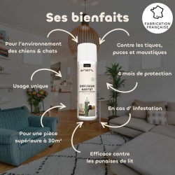 Insecticide à base d’actifs d’origine végétale, destiné au traitement de fond de l’habitat en cas d’infestation par acariens, araignées, blattes, fourmis, mites, puces, punaises de lit et tiques. Très volatile, la solution se dépose dans les moindres recoins où se logent parasites et insectes. Action immédiate et prolongée, jusqu’à 4 mois. Pour une pièce de moins de 15 m² à plus de 30 m². Application interdite sur et en présence des animaux.