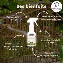 Vous en avez assez de jouer à cache-cache avec les puces ou les tiques ? Notre spray vous offre une action continue jusqu’à 30 jours après une seule utilisation. Votre compagnon à plumes peut donc voler et profiter d'une cage qui sent bon les huiles essentielles.