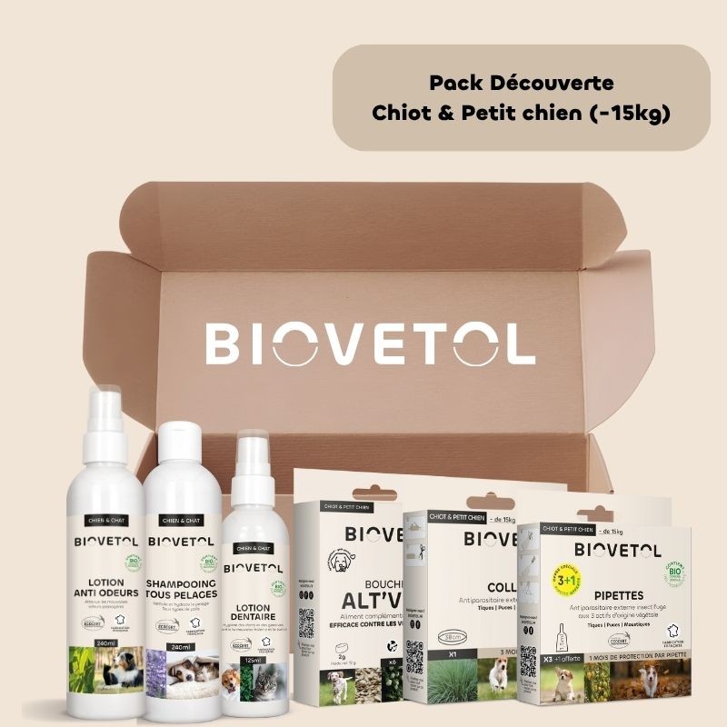 Il est composé : d'une boîte de 3 pipettes Chiot & Petit Chien, un collier petit chien, une boite de bouchées Alt'vers petit chien, un shampooing tous pelages 240ml, une lotion anti-odeurs 240ml et une lotion dentaire 125ml