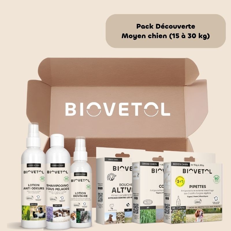Il est composé : d'une boîte de 3 pipettes Moyen Chien, un collier grand chien, une boite de bouchées Alt'vers grand chien, un shampooing tous pelages 240ml, une lotion anti-odeurs 240ml et une lotion dentaire 125ml