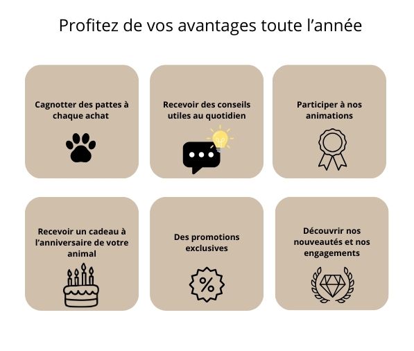 Pour nous, le bien-être de vos compagnons est plus que primordial ! Nous tenons à vous proposer un programme de fidélité qui VOUS ressemble mais surtout qui LEUR ressemble
