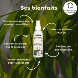 La lotion neutralise les mauvaises odeurs tout en diffusant une agréable senteur. Appliquez-la sur votre petit compagnon pour éliminer les mauvaises odeurs. C'est la garantie de profiter pleinement de votre animal avec un produit à base d’actifs d’origine naturelle.