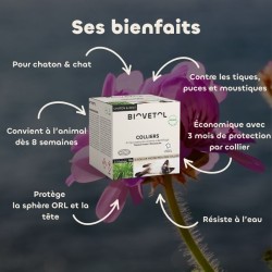Grâce à une diffusion de l’actif, protégez la tête et le cou de votre compagnon dès 8 semaines des parasites sans compromettre son confort. Chez Biovetol, le bien-être de votre chat est notre priorité : notre collier anti-parasites inclut un système de sécurité anti-étranglement et respecte son sens olfactif. Avec Biovetol, offrez une protection efficace, pour un chat heureux et une tranquillité d'esprit garantie.