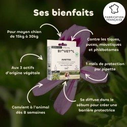 Les chiens sont pleins de surprises… Mais parfois, on se passerait bien de certaines ! Par exemple, quand vous retrouvez des puces, tiques, ou des piqûres de moustiques sur le vôtre. Parce que vous savez qu’en plus de souffrir de démangeaisons, votre compagnon peut être exposé à des maladies. C’est pourquoi, il est important de le protéger régulièrement. Alors, pour prendre soin de votre chien, BIOVETOL a conçu un produit certifié par Ecocert Ecosoin des animaux.Dès 8 semaines / chien de 15 à 30 kg.
