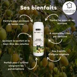 Votre poule ne raffole pas des sprays ? Cette poudre transforme chaque plumage en une armure invincible. Avant ou après chaque aventure, appliquez la poudre à votre animal le protégeant des parasites pendant 1 semaine. Pour vous, c’est l’assurance de prendre soin de votre animal avec un produit à base d’actifs d’origine végétale.