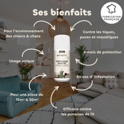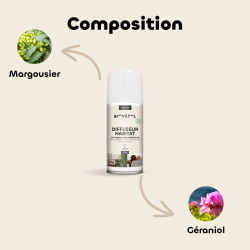 Qui aurait cru qu'un diffuseur garantit un havre sûr pour vos compagnons à quatre pattes ! Sa tactique ? Se volatiliser pour mieux régner, se faufilant avec grâce dans chaque recoin pour préserver vos animaux jusqu'à 4 mois après son utilisation. Pour vous, c’est l’assurance de prendre soin de votre animal avec un produit fait d’actifs d’origine végétale.