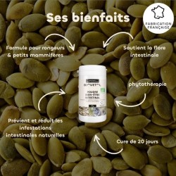 Notre poudre bien-être intestinal n'est pas juste un pansement pour les intestins, c’est aussi ce qui va maintenir les rouages intestinaux de vos rongeurs en parfait état de marche. Avec elle, finis les tracas intestinaux ! Offrez à vos animaux une vie sans souci, où chaque couinement est une ode au bien-être.